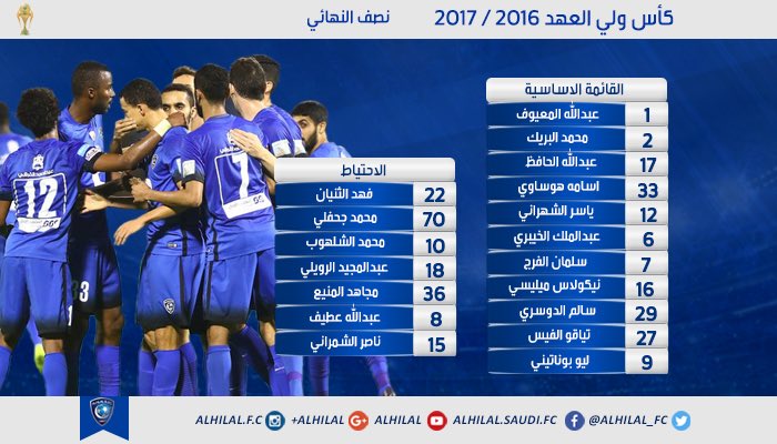 نادي الهلال السعودي בטוויטר تشكيلة الهلال الأساسية وقائمة الاحتياط في مباراة النصر الدور نصف النهائي من بطولة كأس سمو ولي العهد