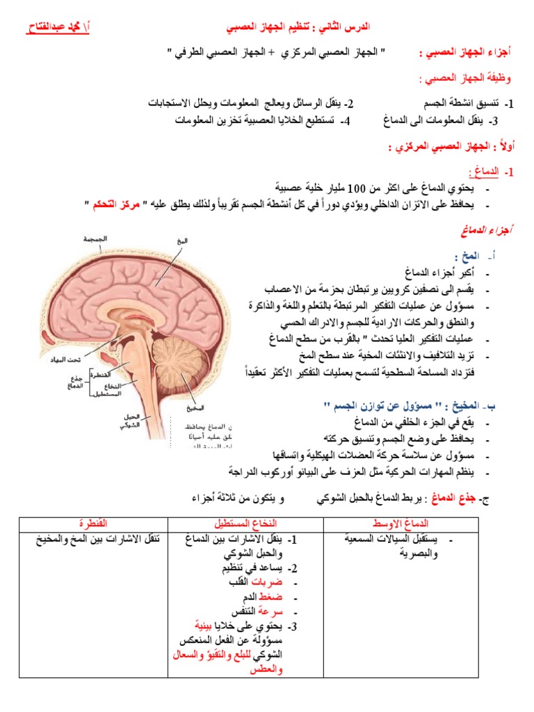 مكونات الجهاز العصبي أحياء فصل أول صف ثاني عشر مدرستي الامارتية