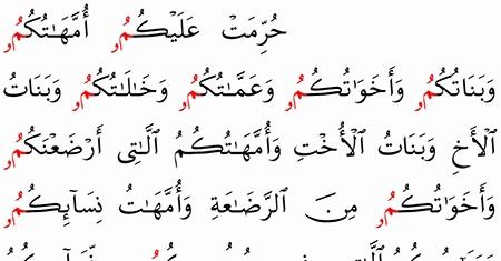 ح ر م ت ع ل ي ك م أ م ه ات ك م و ب ن ات ك م و أ خ و ات ك م و ع م ات ك م و خ ال ات ك م و ب ن ات ال أ خ و ب ن ات ال أ خ ت و أ م ه ات ك م الل ات ي أ ر ض ع ن ك م و أ خ و ات ك م م ن الر ض اع ة و أ م ه ات ن س ائ ك م و ر ب ائ ب ك م