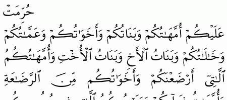 ح ر م ت ع ل ي ك م أ م ه ات ك م و ب ن ات ك م و أ خ و ات ك م و ع م ات ك م و خ ال ات ك م و ب ن ات ال أ خ و ب ن ات ال أ خ ت و أ م ه ات ك م الل ات ي أ ر ض ع ن ك م و أ خ و ات ك م م ن الر ض اع ة و أ م ه ات ن س ائ ك م و ر ب ائ ب ك م